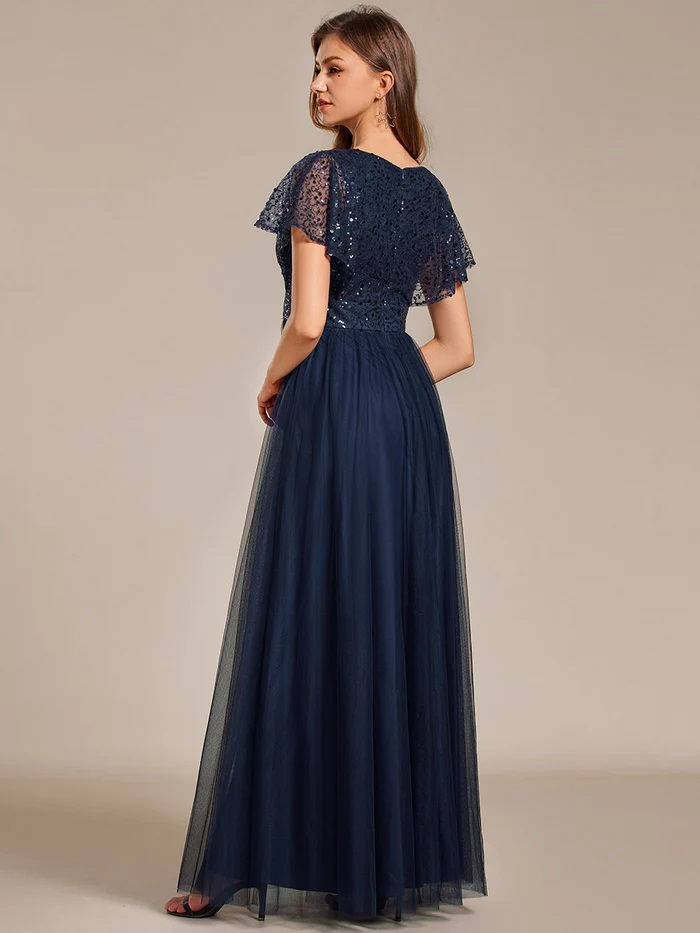 Melina Ruffle Sleeve Sequin Bodice Evening Dress